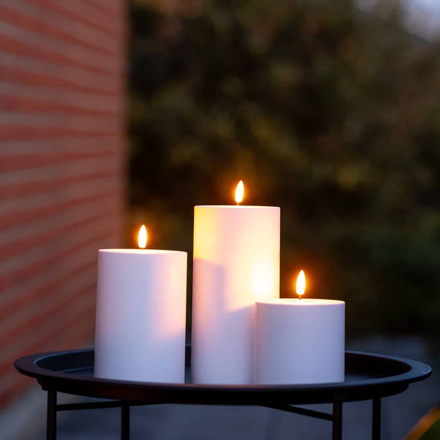De hvide Luca LED-bloklys med batteri er beregnet til udendørs brug, men du kan selvfølgelig også bruge dem indendørs.Â