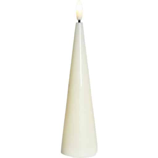 Kunstigt stearinlys i ægte stearin med flakkende LED flamme Med sit enkle, kegleformede design og rene råhvide farve, tilfører dette 17 cm høje LED bloklys fra Sirius en varm og rolig stemning til hjemmet. Flammen er så naturtro, at du næppe bemærker fors