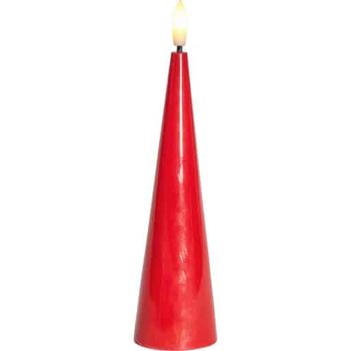 Kunstigt stearinlys i ægte stearin med flakkende LED flamme Med sit enkle, kegleformede design og røde farve, tilfører dette 17 cm høje LED bloklys fra Sirius en varm og rolig stemning til hjemmet. Flammen er så naturtro, at du næppe bemærker forskellen