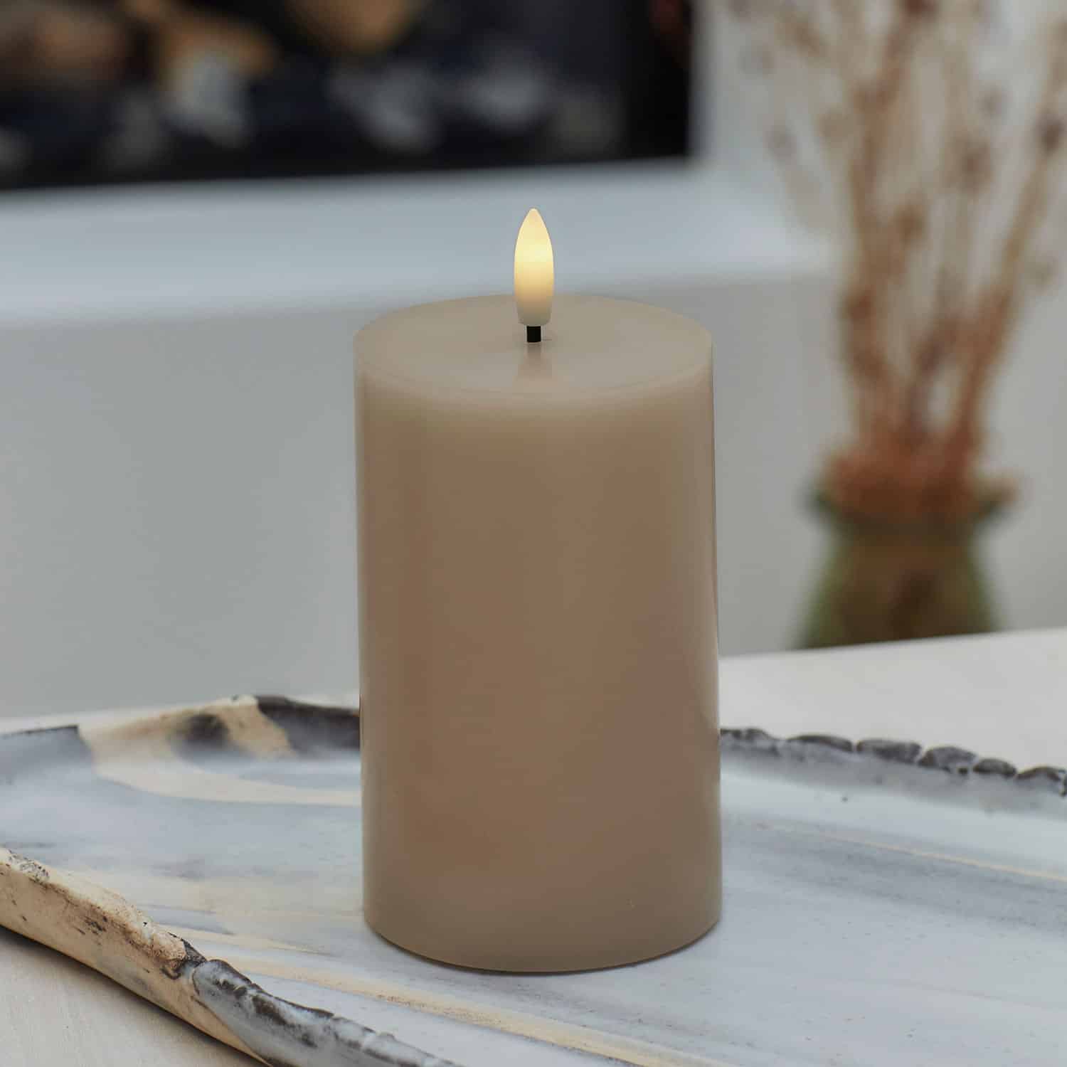 Elegant bloklys fremstillet af ægte stearin med en glat overflade. Lyset har en livagtig flakkende 3D-flamme, der stemningsfyldt tones op og ned og giver en autentisk stearinlyseffekt. I modsætning til traditionelle stearinlys afgiver dette LED-stearinlys